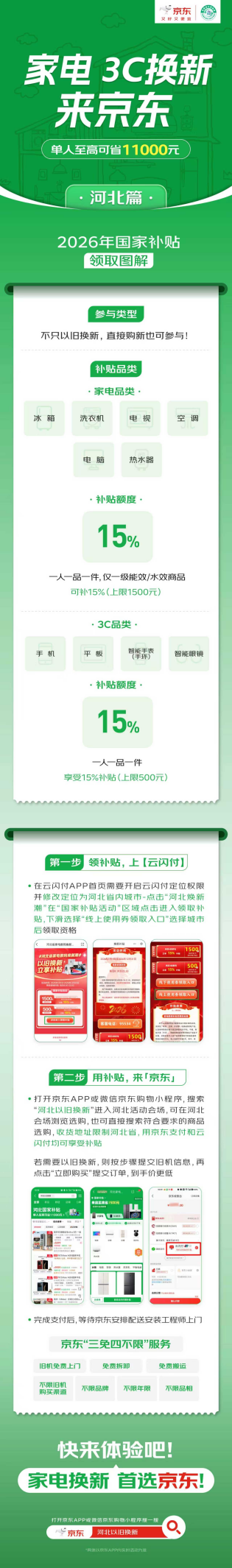 目前,河北国补已上线京东,想换新家电及3C数码的河北消费者,即日起打开京东APP搜索“河北以旧换新”,领国补,选购心仪好物。